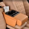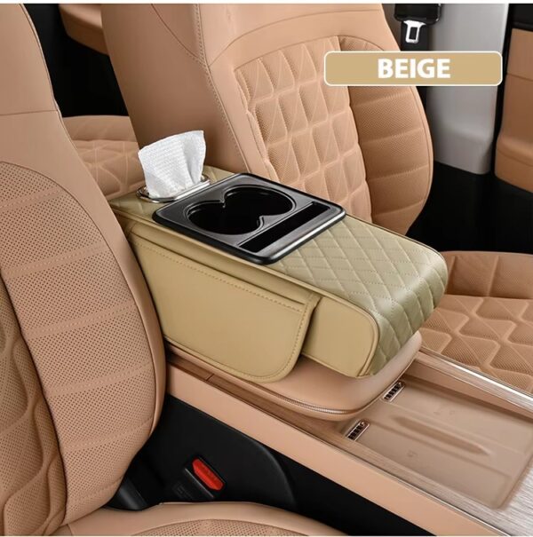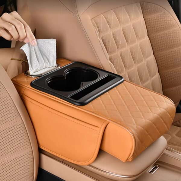 Upgrade your ride with our New Design Auto Center Console Armrest Cushion. 3-in-1 multipurpose pad with dual cup holders, tissue holder, and side storage. Universal fit, high quality, and ultra-convenient. Colors: Black and White