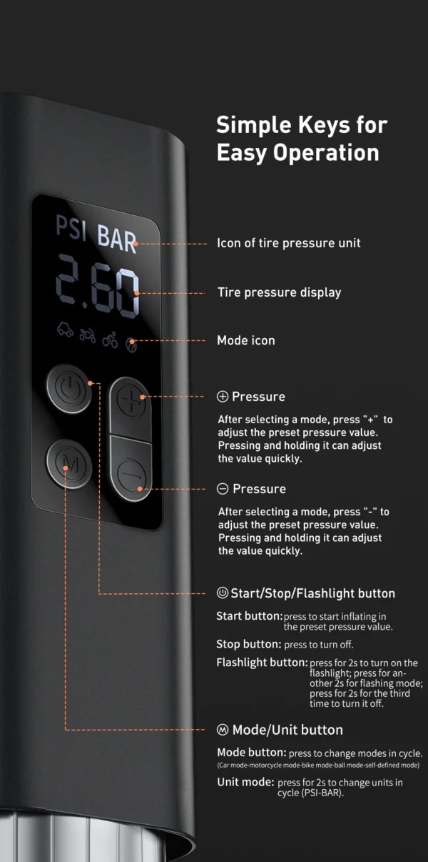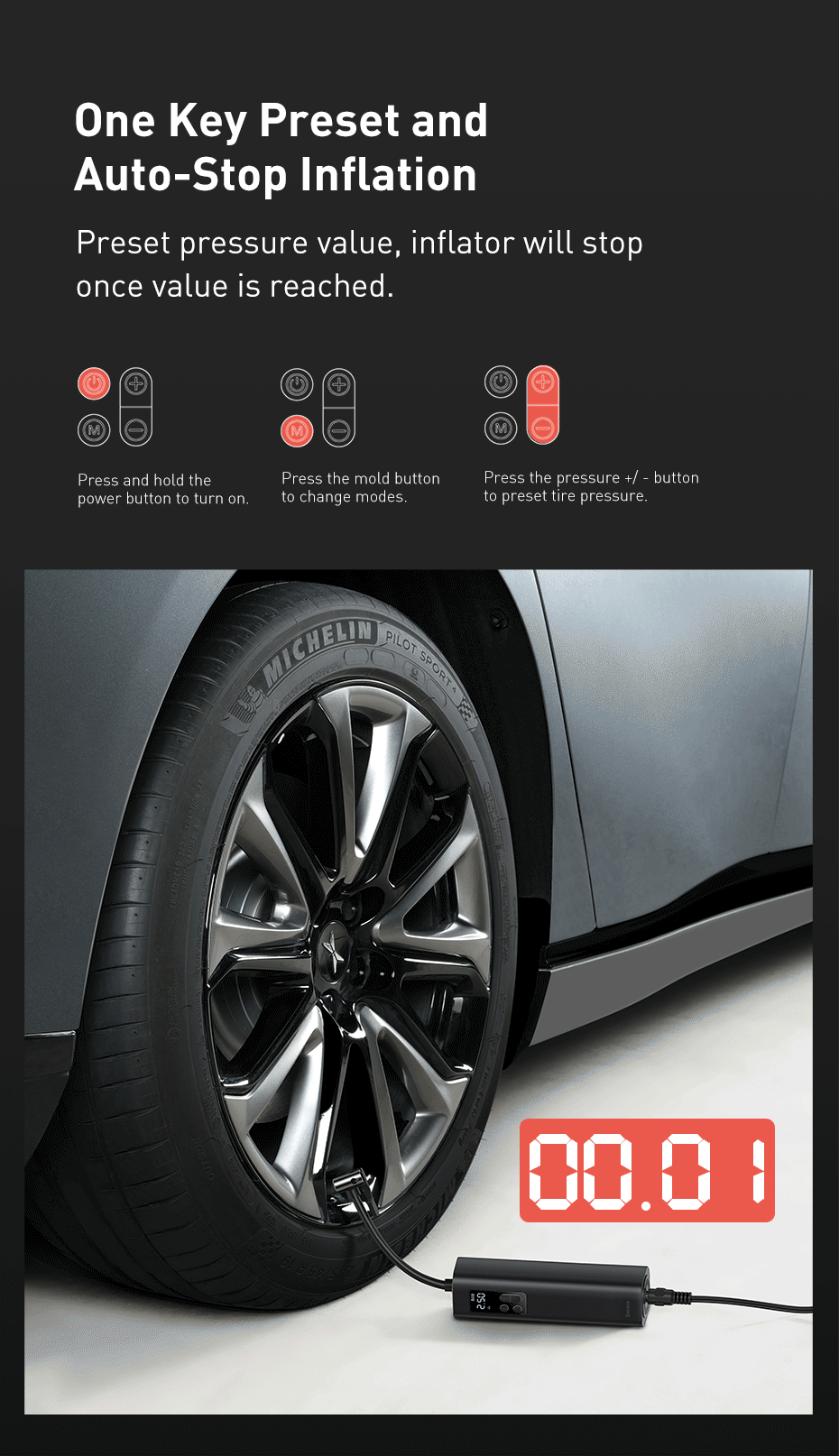 The high-RPM motor pumps up to thirty liters of air per minute, so this pump can reinflate all four tires in under half an hour. Upon that, the intuitive controls and integrated display make using the Baseus Super Mini a breeze.